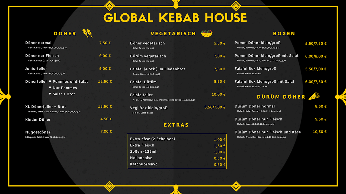 Welcome to Global Kebab House Inh. Enver Kaska, a delightful takeout gem nestled in Bredstedt, Germany. Known for its mouthwatering döners, the menu offers a culinary expedition through flavors that captivate the palate. Customers rave about the freshness and quality of the dishes, with mentions of a delectable döner hamburger and flavorful durum döner that leave you craving more.